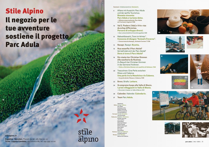 Jannuzzi Smith has developed, designed and produced the magazine Parc Adula. This publication is part of a wide ranging five-year communications programme. With a circulation of ca.15,000 copies the new magazine is to be published twice a year in German, Italian and Romontsch. Parc Adula is set to become the largest national park of Switzerland.