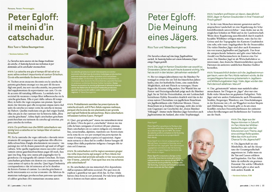“Hunting” is a traditional activity and a hotly debated topic in the region of Parc Adula. Issue 2 of the magazine Parc Adula features an editorial by Nello Bruni (a member of the Executive Board and a representative of Patriziati bleniesi); an overview on the state of hunting by Dr. Peter Meile; a profile on the villages of Mesocco and Soazza; a special insert on Trekking Parc Adula; and much more.